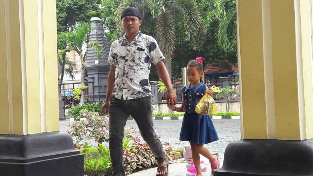 Seperti yang sudah-sudah. Nensi Rahmawati (4 tahun) setia datang ke Pengadilan Negeri (PN) Banyuwangi untuk memberi dukungan bagi ayahnya, Budi Pego.
