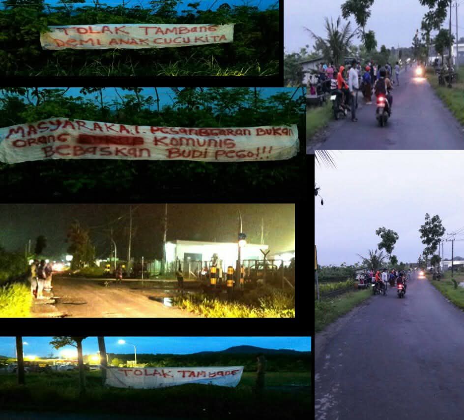 Tak cukup dengan aksi memaksa masuk lokasi tatap muka Wantannas-tokoh masyarakat, warga kontra-tambang yang kurang lebih berjumlah 150 orang itu pun melakukan aksi di depan pintu masuk PT Bumi Suksesindo (perusahaan yang menambang emas di Hutan Lindung Tumpang Pitu). beberapa spanduk berisi pesan penolakan tambang emas dipasang di dekat pintu masuk PT Bumi Suksesindo (BSI). Ari menjelaskan, dipilihnya daerah depan pintu PT BSI sebagai lokasi aksi dan pemasangan spanduk karena daerah itu akan dilintasi rombongan Wantannas. “Dengan dipasang spanduk, saya dan kawan-kawan berharap Wantannas bisa langsung membacanya. Kami ingin Wantannas tahu bahwa tambang emas itu tidak dikehendaki warga. Kami ndak mau CSR, kami maunya tambang itu keluar dari Tumpang Pitu,” tutur Ari.