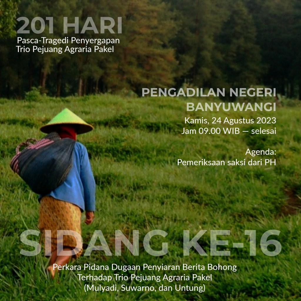 Besok (24/8/2023) di hari ke-201 tragedi penyergapan Trio Pejuang Agraria Pakel (Mulyadi, Suwarno, Untung), di ruang Cakra Pengadilan Negeri (PN) Banyuwangi, sidang akan dilanjutkan.