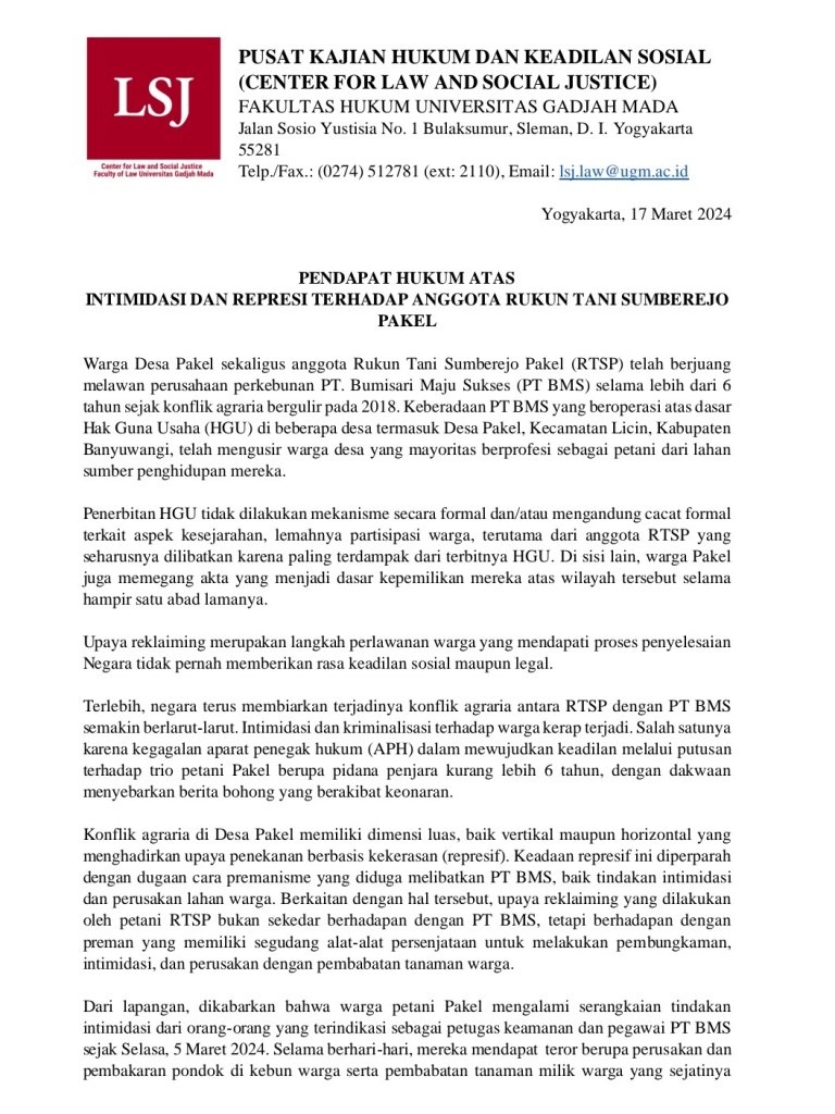 Demikian pendapat hukum dibuat secara ringkas untuk mencegah kekerasan berlanjut serta mendesak pertanggungjawaban hukum atas kasus kekerasan yang menimpa warga Pakel.