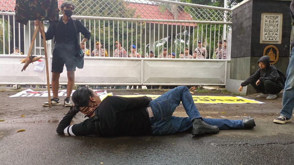 Salah seorang peserta aksi tampak santai tiduran di aspal yang basah karena bekas gerimis.