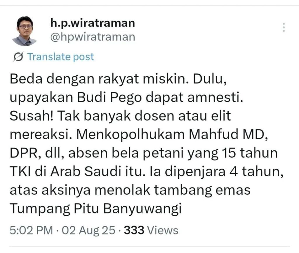 Mengomparasi ditolaknya amnesti Budi Pego dengan mulusnya pemberian abolisi dan amnesti kepada Tom Lembong serta Hasto, kian menguatkan adagium “hukum di Indonesia lebih berpihak kepada elit, bukan kepada rakyat kecil.” Hukum tumpul ke atas, tajam ke bawah. Tegas ke rakyat kecil, tetapi mengkeret ke pembesar negeri.