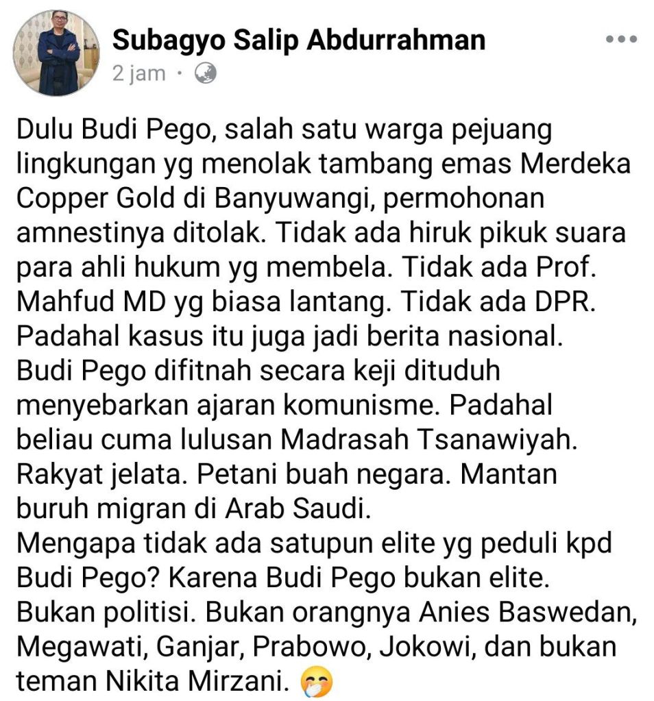 Pemberian abolisi dan amnesti tersebut, mengingatkan kita pada upaya permohonan amnesti Budi Pego (petani buah naga penolak tambang emas Tumpang Pitu, yang dikriminalisasi & dipenjara karena didakwa menyebarkan ajaran komunisme).