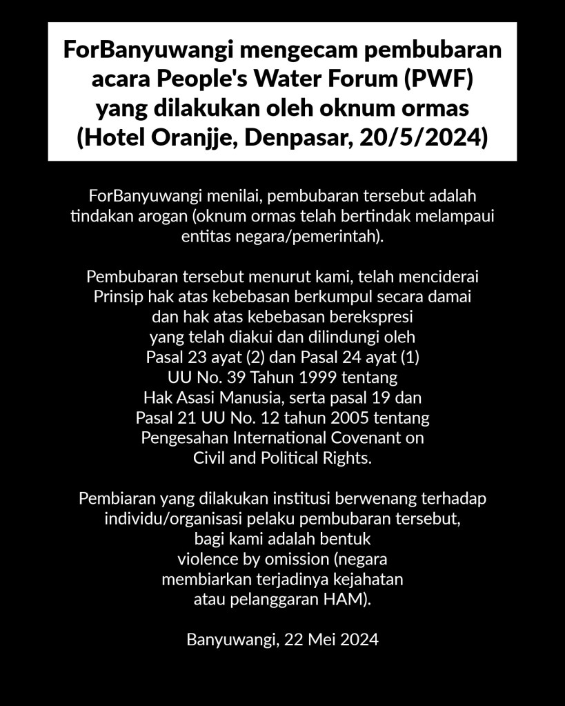 ForBanyuwangi menilai, pembubaran tersebut adalah tindakan arogan (oknum ormas telah bertindak melampaui entitas negara/pemerintah).